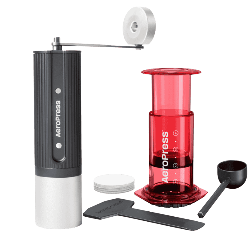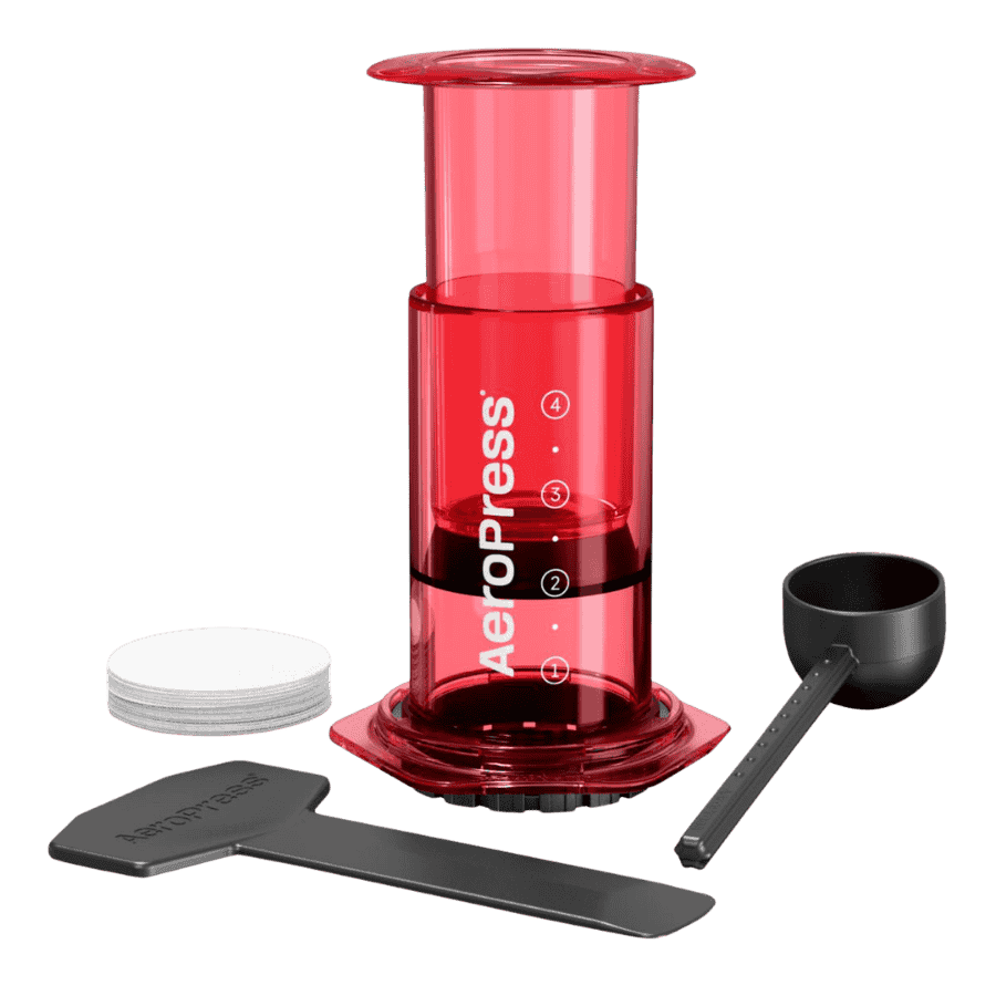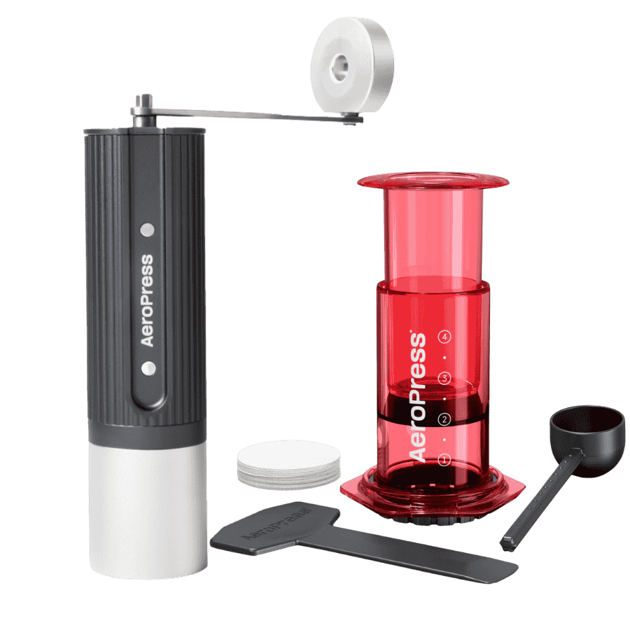 | Zestaw zawiera AeroPress Clear Red (przezroczysty czerwony) Ręczny młynek szary 100 filtrów papierowych Mieszadło i miarka |