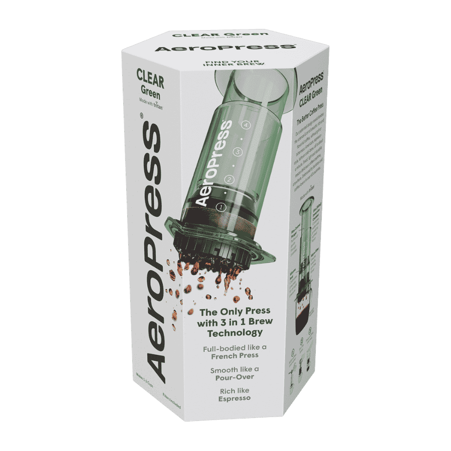 Dlaczego AeroPress Clear Green? Bo wierzymy, że rytuał parzenia kawy powinien wyciszać i cieszyć oko. Wersja Clear Green to transparentna, butelkowa zieleń, która nadaje kultowemu zaparzaczowi organiczny, szlachetny charakter. Wykonany z wytrzymałego Tritanu™, łączy niezawodność z estetyką bliską naturze. To idealny wybór dla tych, którzy szukają harmonii w codziennych czynnościach.