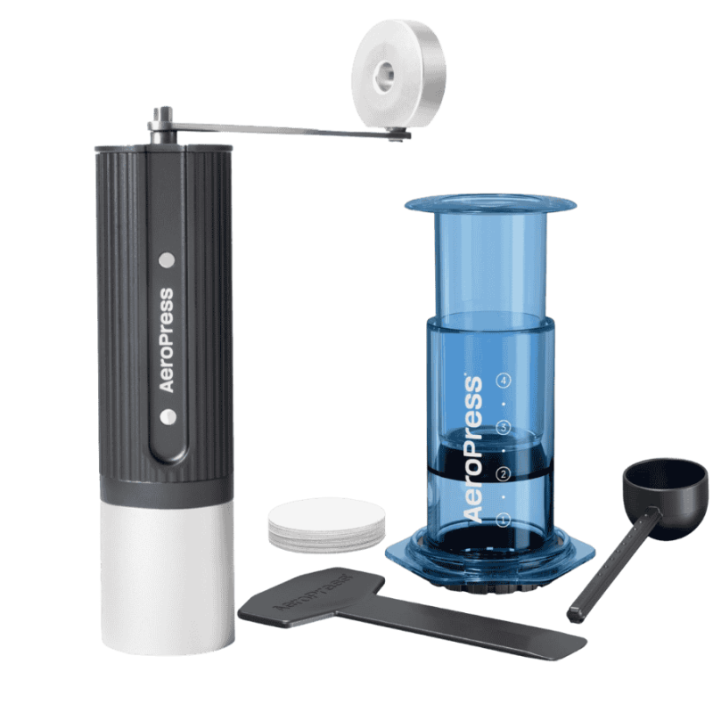 | Zestaw zawiera AeroPress Clear Blue (przezroczysty niebieski) Ręczny młynek szary 100 filtrów papierowych Mieszadło i miarka |