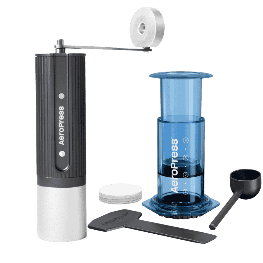 AeroPress Coffee Maker Clear Blue + ręczny młynek szary