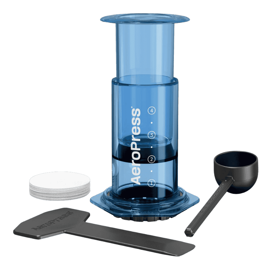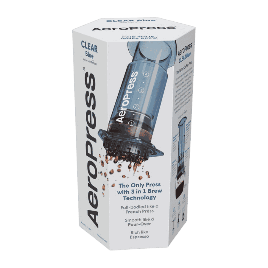 - AeroPress Clear Blue – przezroczysty korpus w świeżym niebieskim kolorze. Widzisz cały proces i masz pełną kontrolę.
