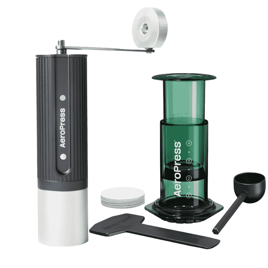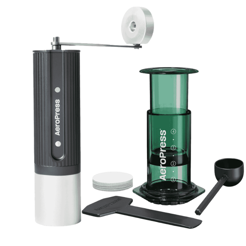AeroPress Coffee Maker Clear Green + ręczny młynek szary