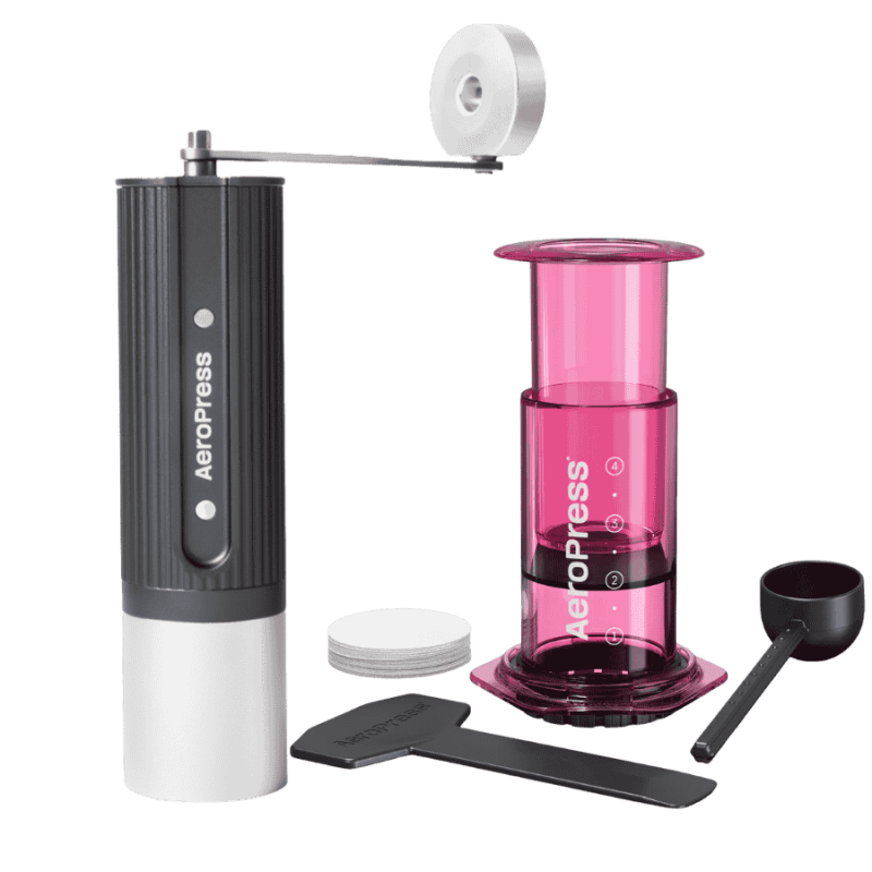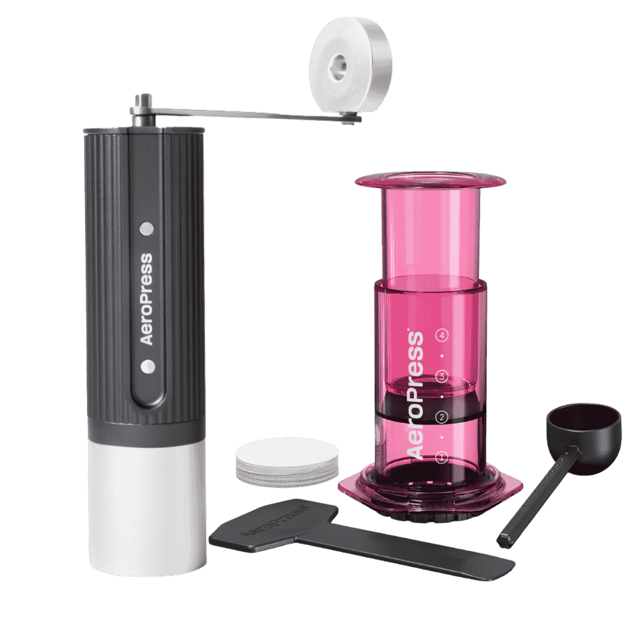 | Zestaw zawiera AeroPress Clear Pink (przezroczysty różowy) Ręczny młynek szary 100 filtrów papierowych Mieszadło i miarka |