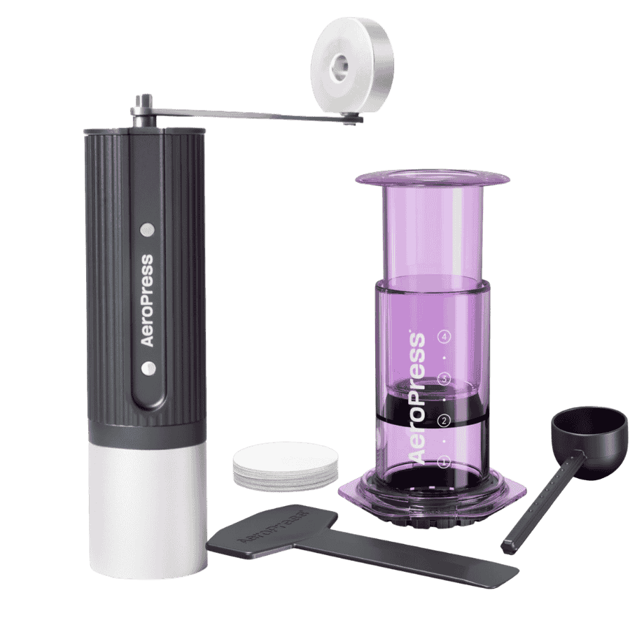 AeroPress - Młynek ręczny szary + AeroPress Clear Purple Coffee Maker zaparzacz do kawy przezroczysty fioletowy