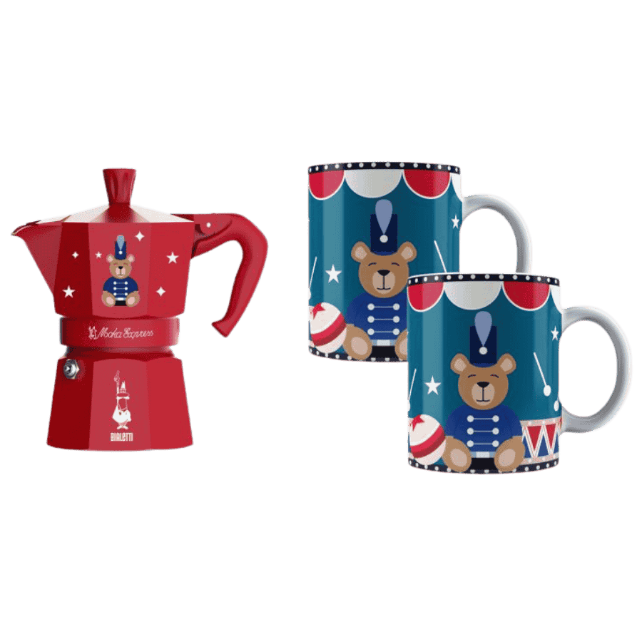 Zestaw Bialetti Joyful Christmas 6TZ to propozycja dla tych, którzy kochają dzielić się magią Świąt. Pojemna kawiarka w kolorze intensywnej czerwieni, ozdobiona motywami tradycyjnych zabawek, przygotuje napar dla całej rodziny. Dopełnieniem zestawu są dwa duże, porcelanowe kubki o pojemności 300 ml – idealne na zimowe cappuccino, latte lub aromatyczne americano przy choince.
