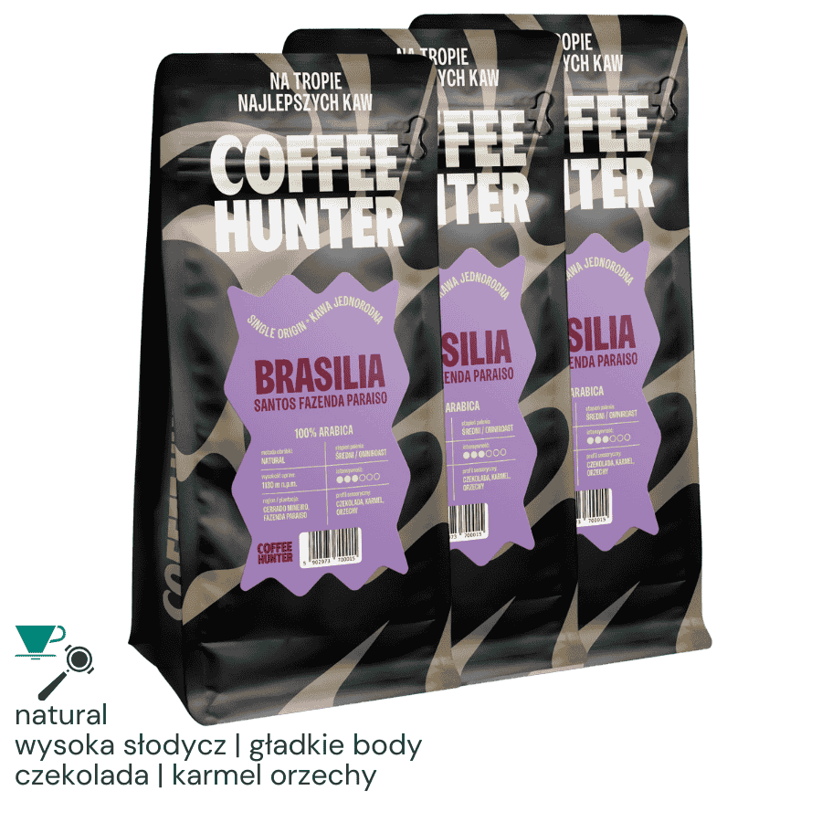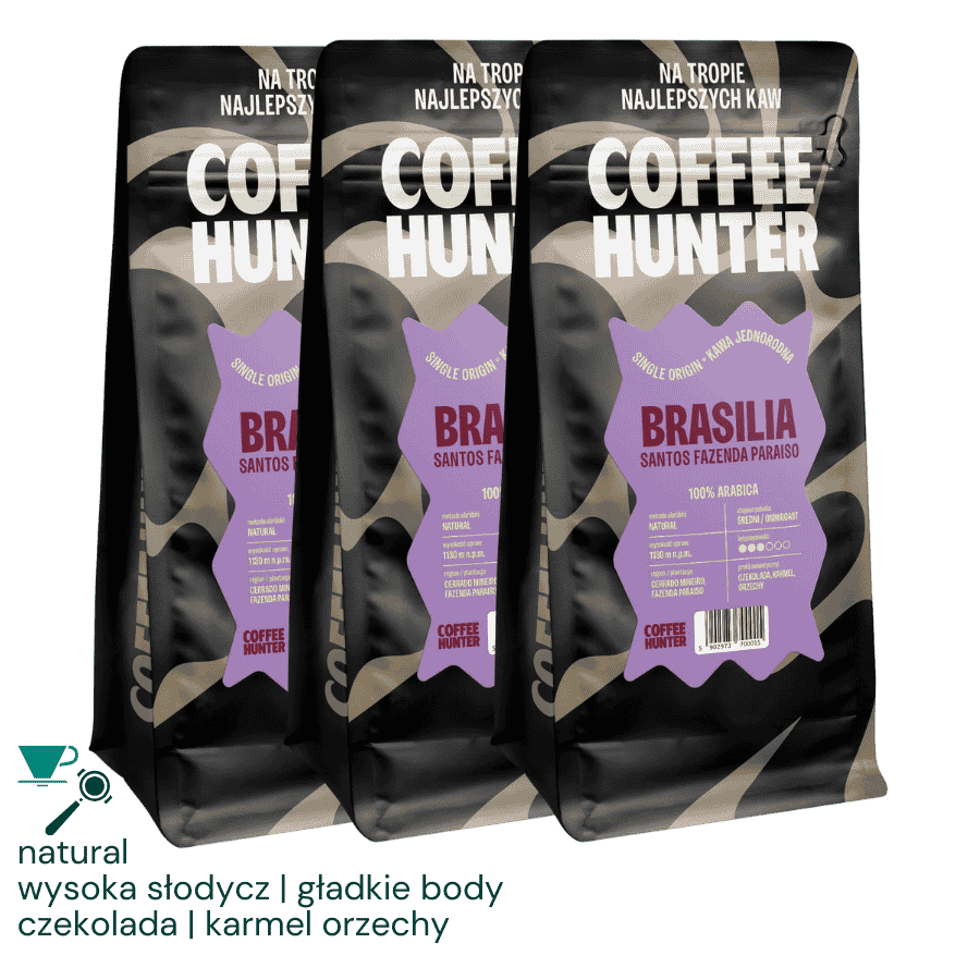 Kawa ziarnista Santos Fazenda Paraiso – zestaw 3 x 1 kg – Brazylia natural z nutami czekolady, karmelu i orzechów – Palarnia Coffee Hunter
