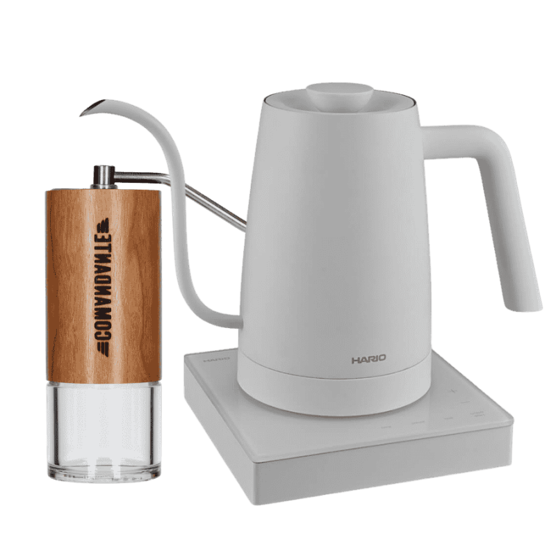 - Hario Lyra 800 ml Biały – czajnik stworzony do przelewów: precyzyjna wylewka, dokładna temperatura i śnieżnobiały mat, który idealnie kontrastuje z ciepłym drewnem Comandante.