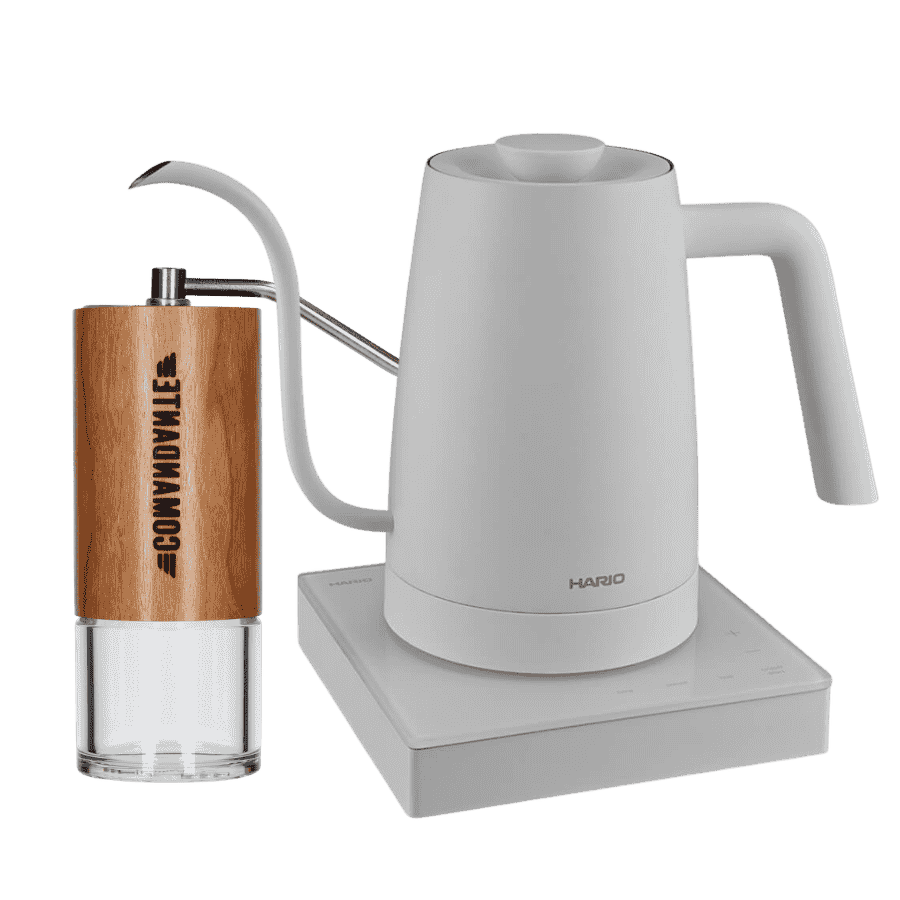 Elektryczny czajnik z precyzyjną wylewką, regulacją 50–96 °C i funkcją keep-warm. Matowa biel idealnie współgra z ciepłym drewnem Comandante – razem tworzą najpiękniejszy zestaw do przelewów na rynku.