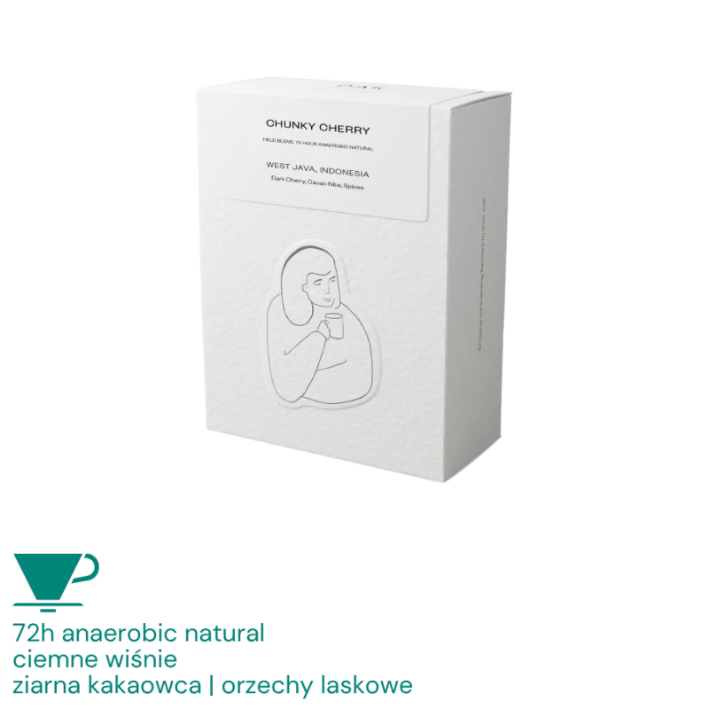 Frinsa Estate w Indonezji jest znana z eksperymentalnych procesów fermentacyjnych. W przypadku Chunky Cherry zastosowano 72-godzinną fermentację beztlenową (Anaerobic Natural), która wydobywa z kawy bardzo wysoką słodycz, lekko winne nuty i intensywną owocowość. To jeden z powodów, dla których ta kawa wraca do oferty już piąty raz.