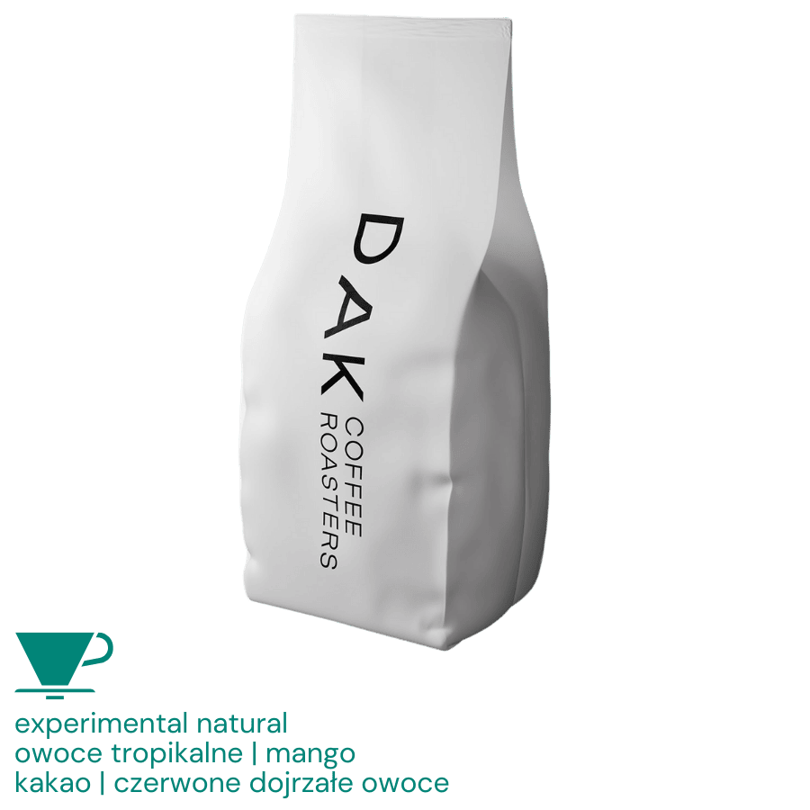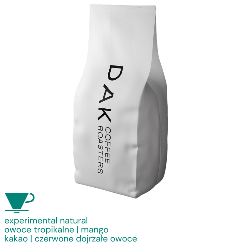 The Alchemist to jedna z najbardziej rozpoznawalnych propozycji palarni DAK, teraz dostępna w ekonomicznym opakowaniu 1 kg. Ziarna Bourbon z farmy Gasharu zostały poddane eksperymentalnej obróbce naturalnej, co pozwoliło uzyskać profil przypominający owocową alchemię. W filiżance dominuje soczystość dojrzałego mango i intensywność owoców tropikalnych, które harmonijnie łączą się z deserowym finiszem kakao.