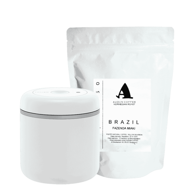 Fellow Atmos w białym macie łączy minimalistyczny styl z funkcjonalnością. Wykonany ze stali nierdzewnej pokrytej emalią i trwałego tworzywa sztucznego, chroni kawę przed światłem i wilgocią. W zestawie z Audun Brazylia Miaki 250 g to idealne rozwiązanie dla miłośników kawy ceniących jakość i estetykę.