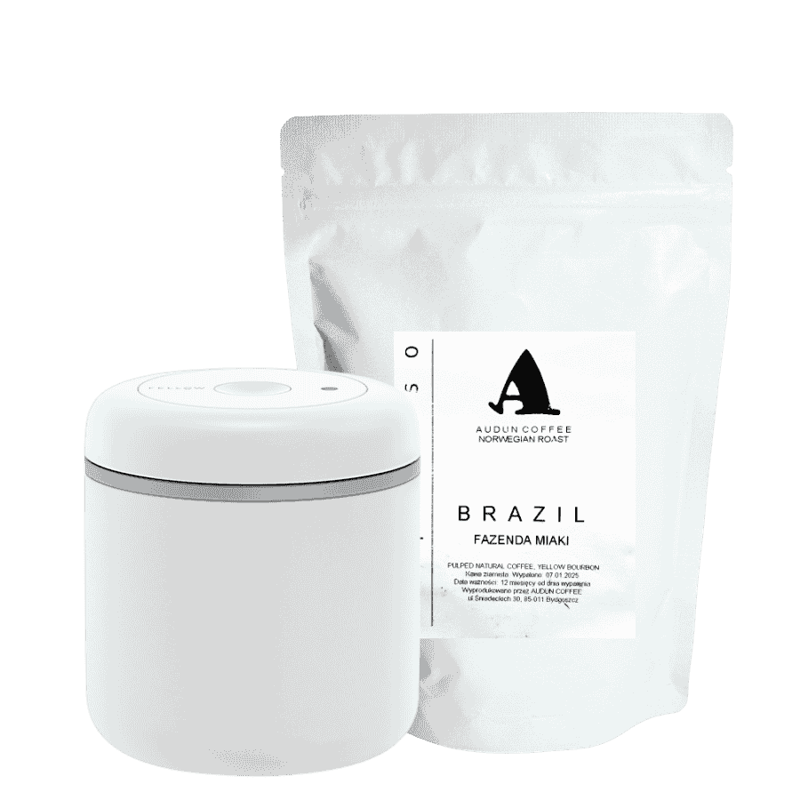 Audun Brazylia Miaki 250 g to kawa ziarnista stworzona z myślą o ekspresach i kawiarkach, oferująca bogaty aromat i wyważony smak. Idealnie współgra z próżniowym pojemnikiem Fellow Atmos, który chroni ziarna przed utratą świeżości.
