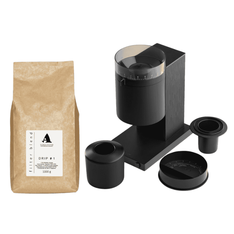 | Zestaw zawiera Fellow Opus Grinder (czarny mat) Audun Drip No. 1 Rwanda filtr 1 kg |