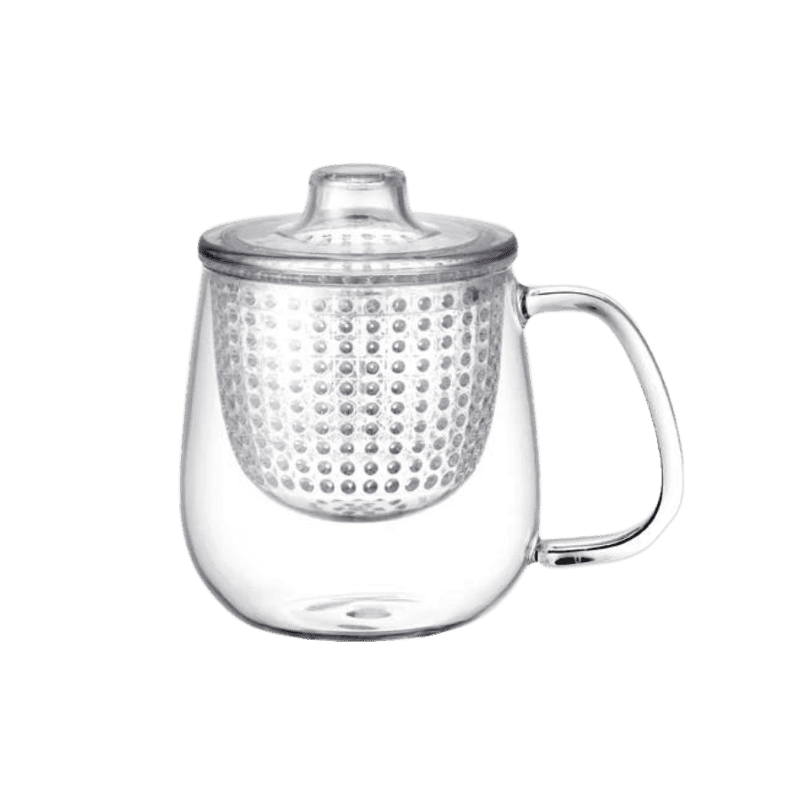 Kinto Unimug to jeden z najbardziej rozpoznawalnych projektów japońskiej marki. Przezroczyste ścianki ze szkła żaroodpornego pozwalają cieszyć się wizualnym aspektem parzenia, od zmiany koloru naparu po obserwację liści. Ergonomiczne, szerokie ucho sprawia, że kubek pewnie leży w dłoni, nawet gdy jest wypełniony po brzegi. Zastosowanie filtra z tworzywa sztucznego (BPA Free) gwarantuje trwałość – sitko jest odporne na stłuczenia i pozwala na swobodne rozwijanie się liści herbaty.