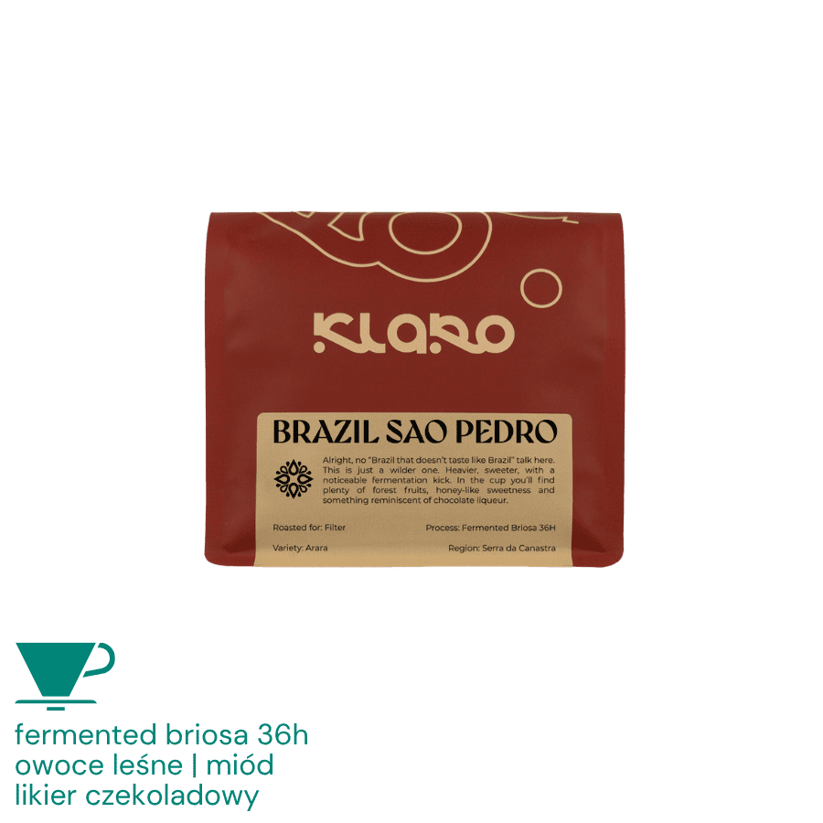 Brazil Sao Pedro to brazylijska kawa specialty z regionu Serra da Canastra, pochodząca od producentów Edsona Luiza Ignacio i Mauricio Mendesa. Uprawiana na wysokości 1250 m n.p.m. z odmiany Arara, poddana procesowi Fermented Briosa 36H (beztlenowa fermentacja z dodatkiem drożdży). Jasne palenie Klaro Coffee wydobywa z niej intensywną słodycz i owocowość dedykowaną metodom przelewowym. W filiżance dominują owoce leśne, słodki miód i głęboki likier czekoladowy – kawa cięższa, słodsza, z wyraźną nutą fermentacji, idealna gdy masz ochotę na coś innego.