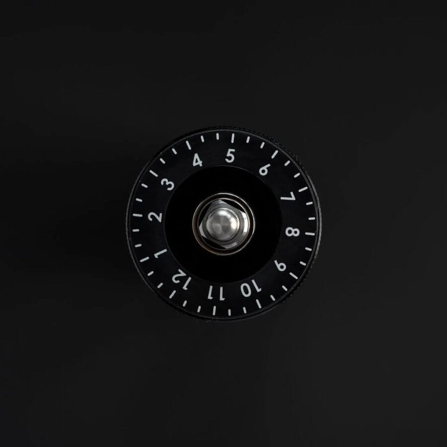 - Bezstopniowa regulacja – precyzyjne aluminiowe pokrętło na górze młynka z laserowo grawerowaną skalą umożliwia błyskawiczne zmiany ustawień.