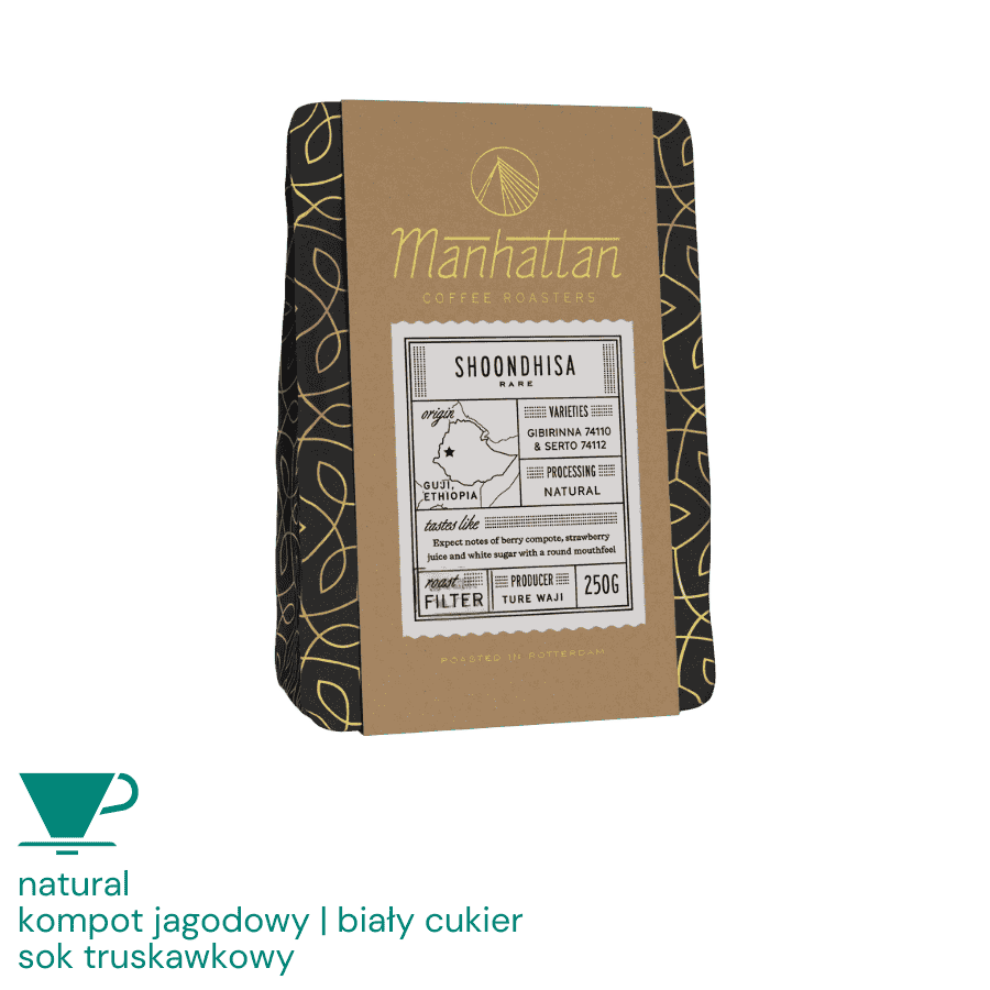 Kawa ziarnista Specialty Shoondhisa Natural 250 g – Etiopia z nutami kompotu jagodowego, białego cukru i soku truskawkowego – Palarnia Manhattan Coffee