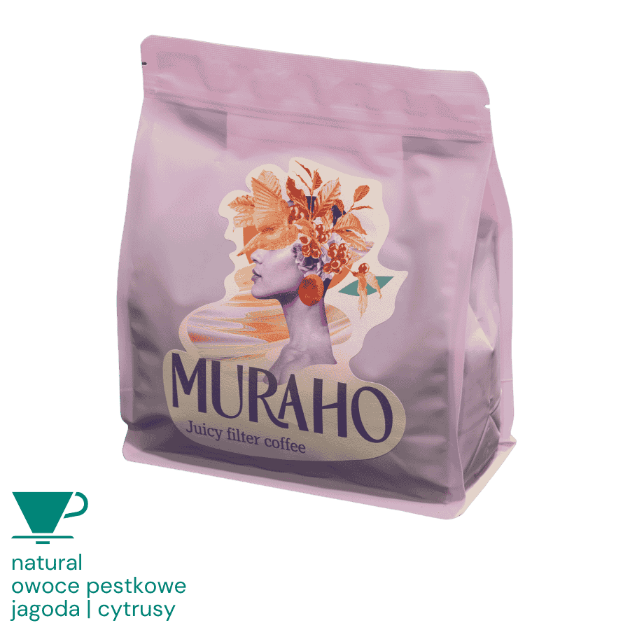 Red Bourbon z regionu Gituntu w Rwandzie, uprawiana na wysokości 1600–2000 m n.p.m., obrabiana metodą natural. Jasne palenie palarni Muraho! wydobywa z niej intensywną owocowość i soczystość dedykowaną metodom przelewowym. W filiżance dominują słodkie owoce pestkowe, soczyste jagody i rześkie cytrusy – kawa owocowa, czysta i niezwykle przyjemna.