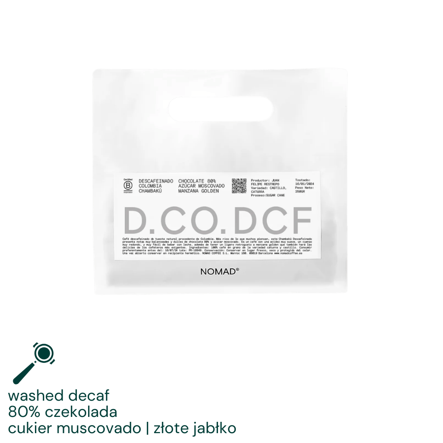 Bezkofeinowa Kolumbia z Finca Chambakú – Felipe Restrepo w 2023 roku udoskonalił cały proces suszenia (mechaniczne silosy), co dało stabilniejszą kawę, dłuższą świeżość i bardziej ekspresyjny kubek. Proces washed + decaf etylowo-octowy (z melasy trzcinowej, min. 97% usuniętej kofeiny, max 20 ppm pozostałości) zachowuje naturalną słodycz i czystość. Średnio palona przez Nomad Coffee – idealna do espresso i kaw mlecznych, z bogatą czekoladą 80%, cukrem trzcinowym i subtelnym złotym jabłkiem. Bardzo krągła, łatwa w piciu i łagodna w kwasowości.