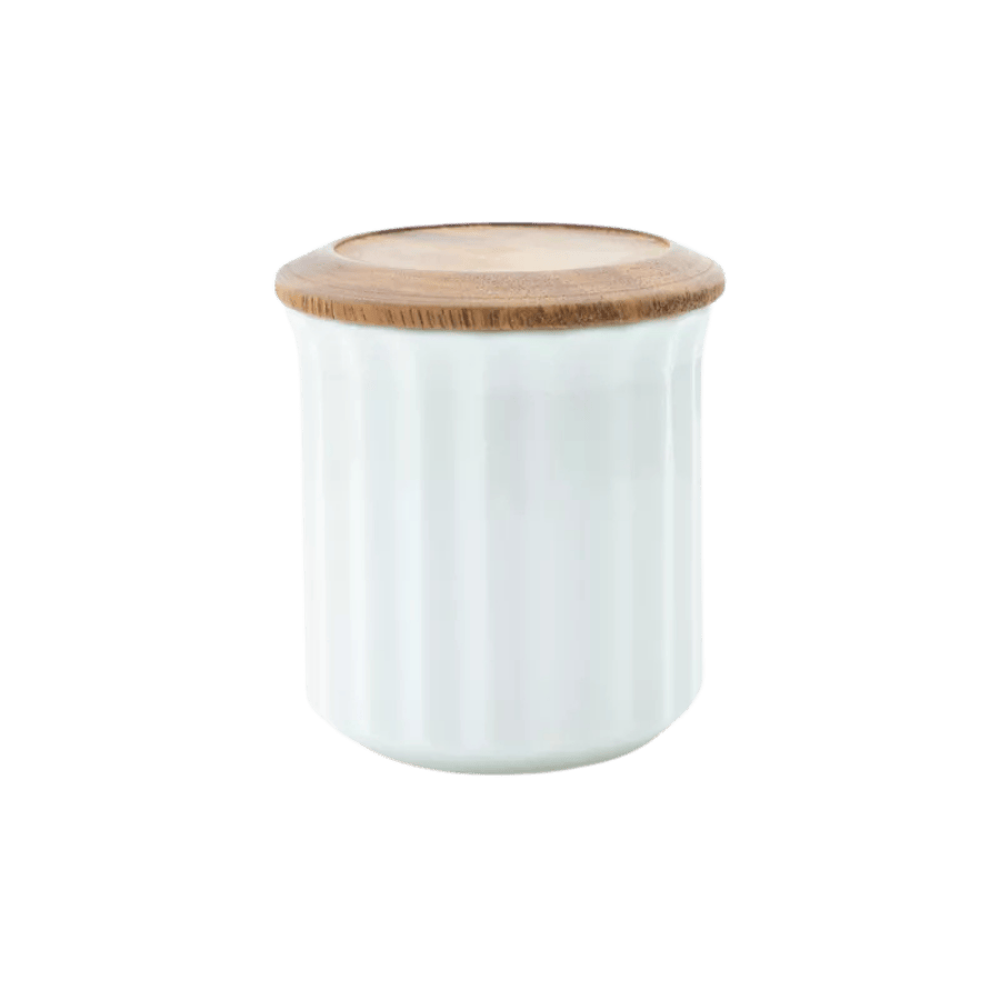 Origami Canister 200 g White to pięknie zaprojektowany pojemnik, który łączy japońską porcelanę z regionu Mino z naturalną pokrywką z akacjowego drewna. Nie tylko chroni kawę przed światłem, wilgocią i zapachami, ale również stanowi stylową ozdobę kuchni lub kawiarni.