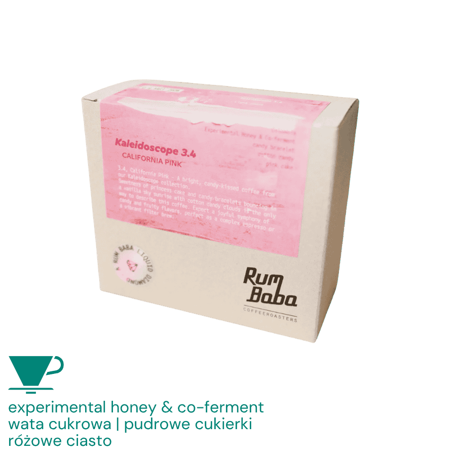 Kaleidoscope 3.4 „California Pink” to radosna symfonia smaków, która przeniesie Cię prosto do świata różowej waty cukrowej i waniliowych wschodów słońca. Ta wyjątkowa edycja bazuje na szlachetnej odmianie Pink Bourbon, poddanej wieloetapowej obróbce Honey z kofiermentacją bananową. Rezultatem jest niezwykle kremowe body z delikatną nutą banana, owinięte w intensywną słodycz przypominającą pudrowe cukierki i puszyste ciasto.