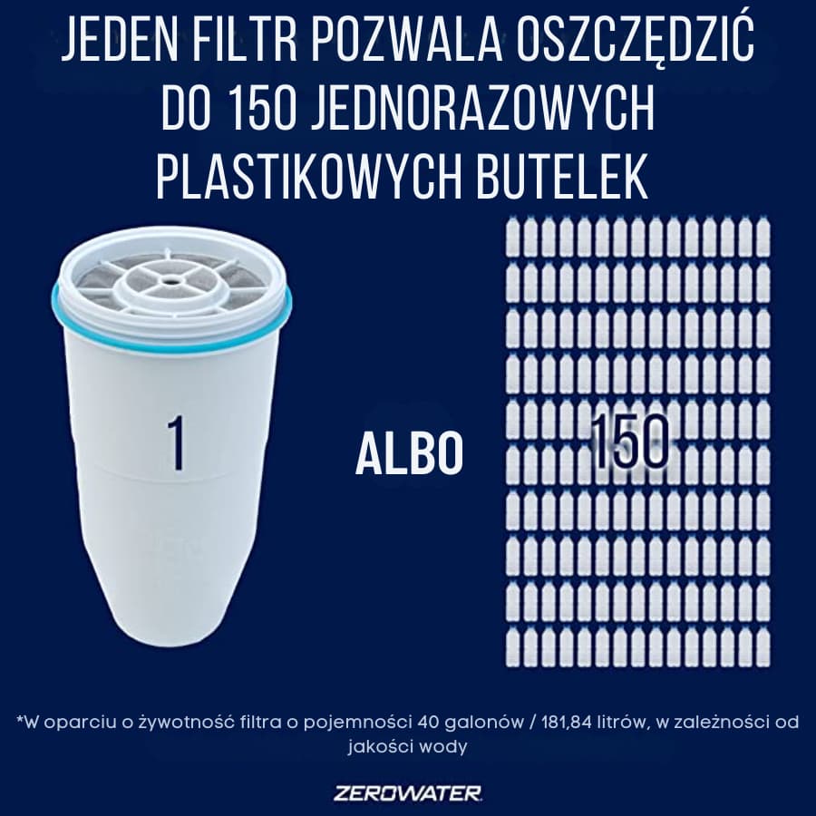 - Kontrola jakości: Filtrację ZeroWater należy przerwać, gdy dołączony do dzbanka miernik TDS wskaże wynik 006 – posiadanie drugiego filtra pozwala na natychmiastową wymianę.